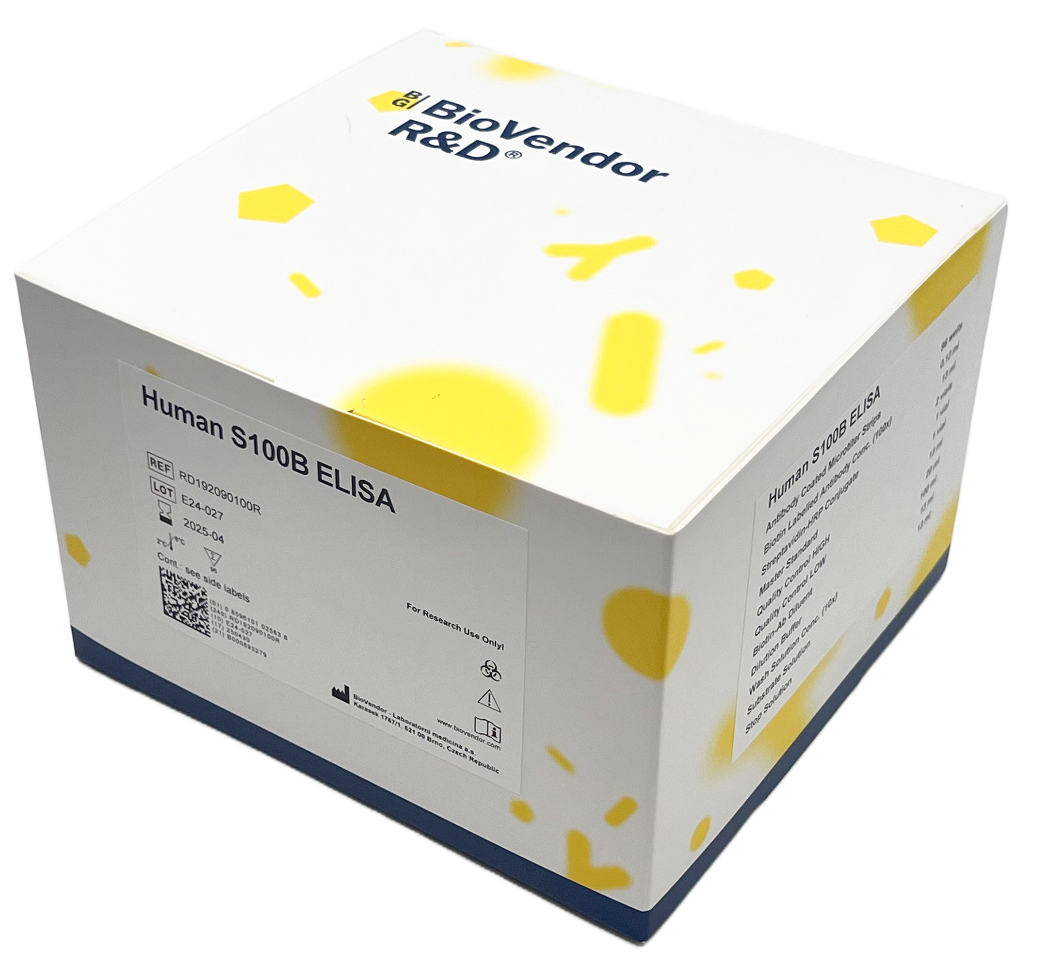S-100B protein is a member of highly homologous acidic calcium and zinc binding proteins family (S100 family) that possess two EF-hand motifs. S100B is a bb homodimer with the molecular weight 21 kDa. S100B is abundant in the nervous system where it is predominantly expressed in astrocytes, oligodendrocytes and Schwann cells. S100B is released from brain tissue into cerebrospinal fluid (CSF) and blood following brain damage of different origin, i.e., brain infarction, intracerebral or subarachnoidal hemorrhage, neurotrauma and large intracerebral tumors. It is documented a relationship between degree of cell damage and S100B levels in CSF. Also patients with progressive melanoma disease show elevated serum concentrations of S100B.